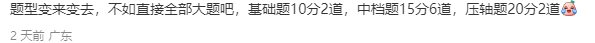 4、大题分值变化。目前有两种较大可能性,第一种分值组合10+10+13+13+15+17,第二种分值组合11+11+11+13+15。