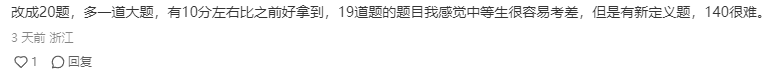 有不少网友认为,大题题量变成6道之后,对考生要求实际上更高,在做题速度上要求更高。如果高考数学按目前网传板块改为20题,对于大部分同学而言,要考上140分,难度无疑增加。